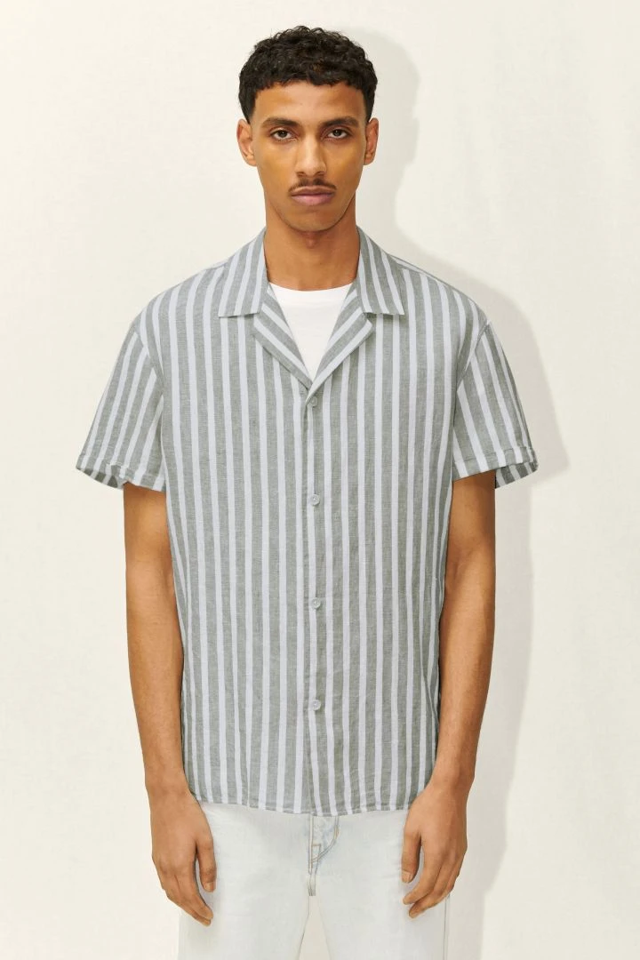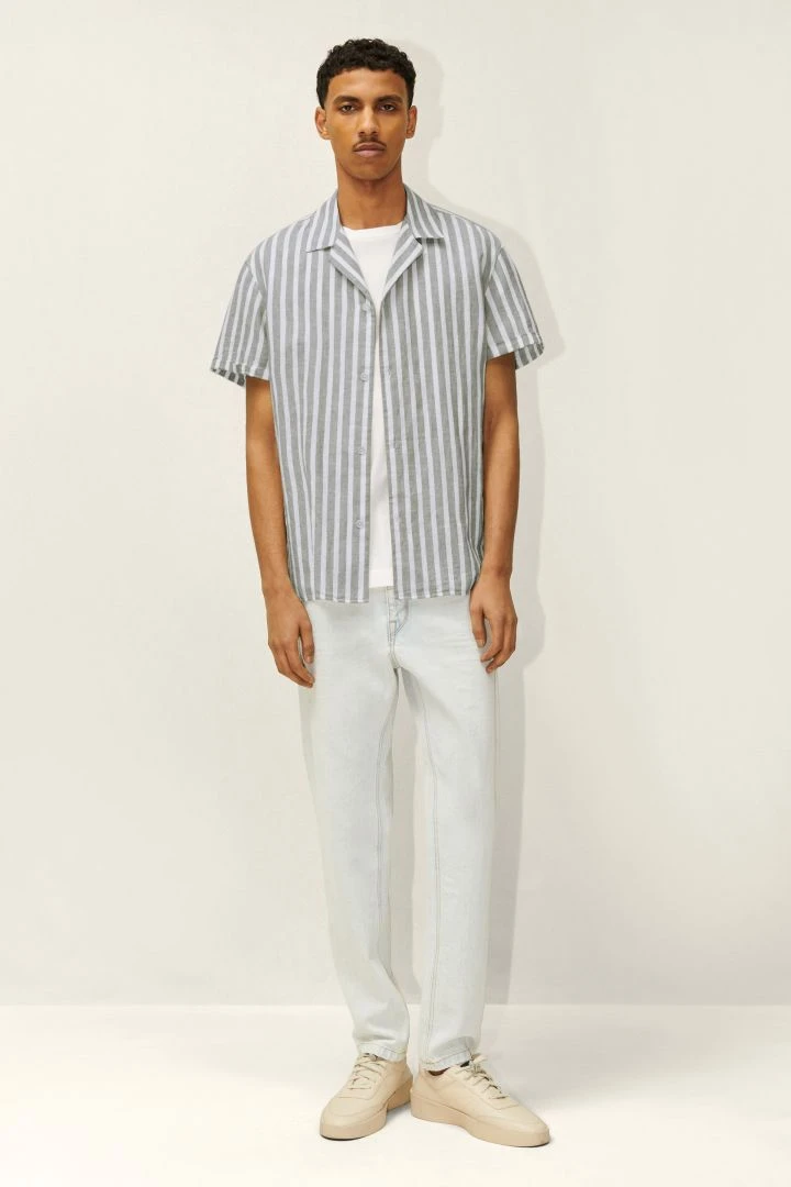 BIJAN hat ein breites Streifen Dessin und besteht aus einem luftigen Baumwoll-Leinen Mix.