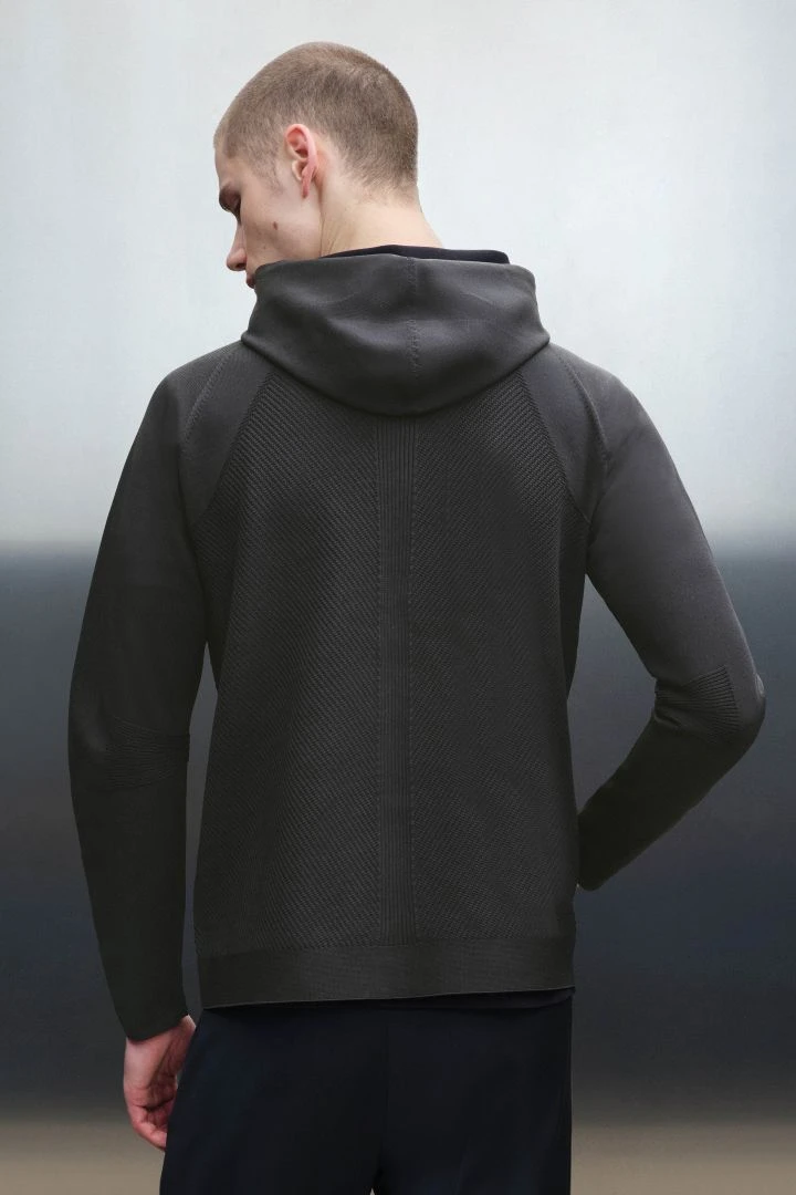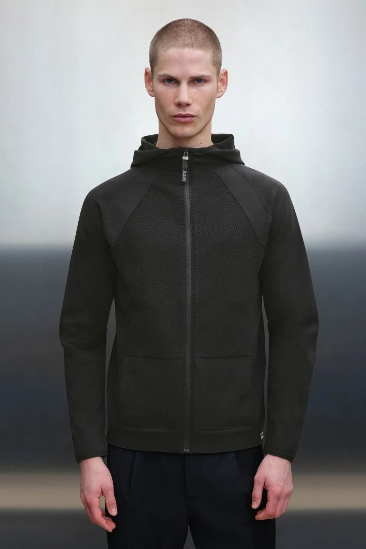 AIMO ist ein technisch gestrickter Zip-Hoodie mit Raglanärmeln und aufgesetzten Eingrifftaschen.
