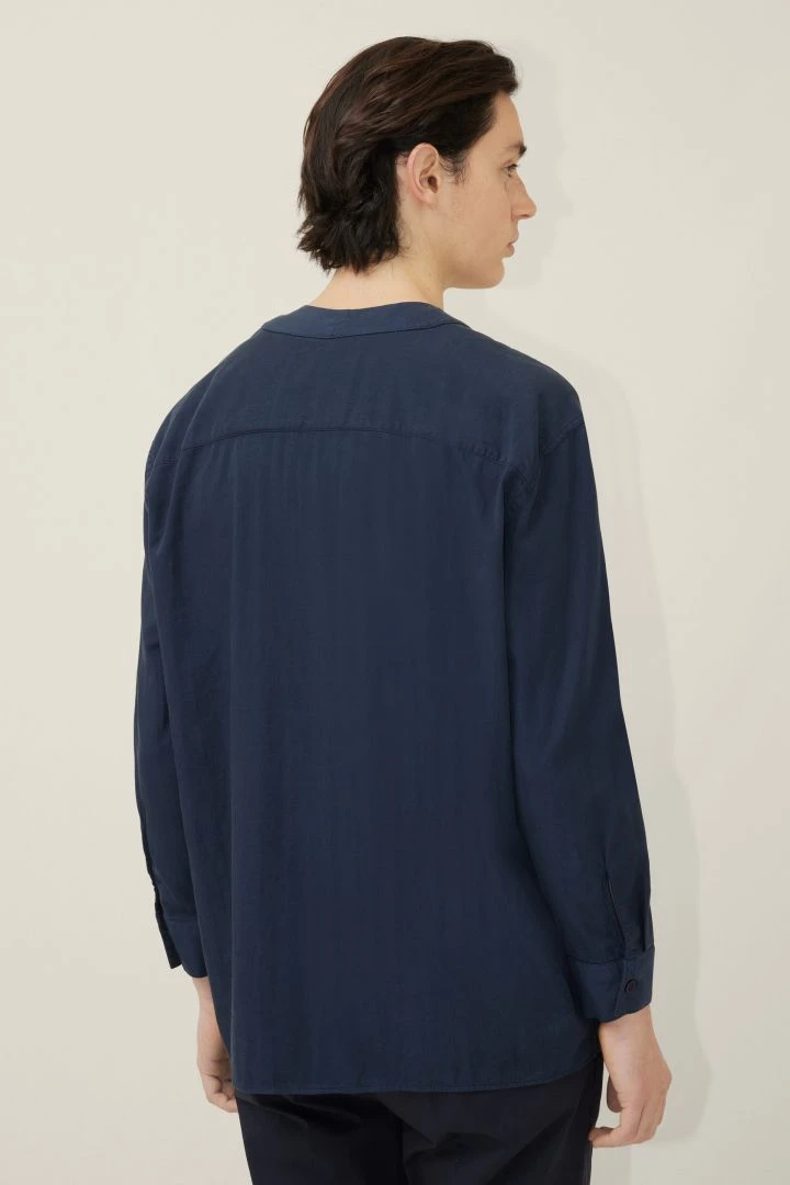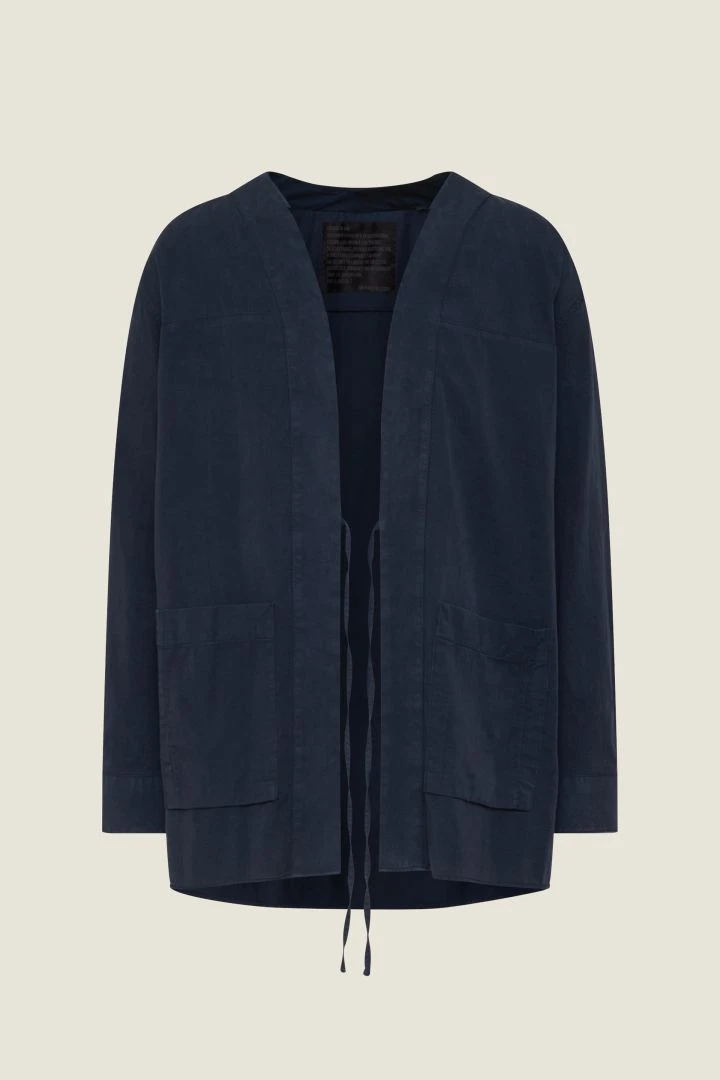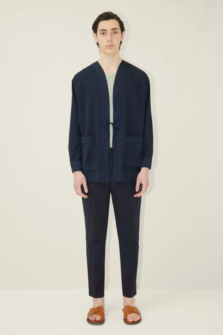 OMIC ist ein knopfloses Kimonohemd mit dünnem innenliegenden Bindegürtel. Es hat einen Schalkragen und 2 aufgesetzte Taschen.
