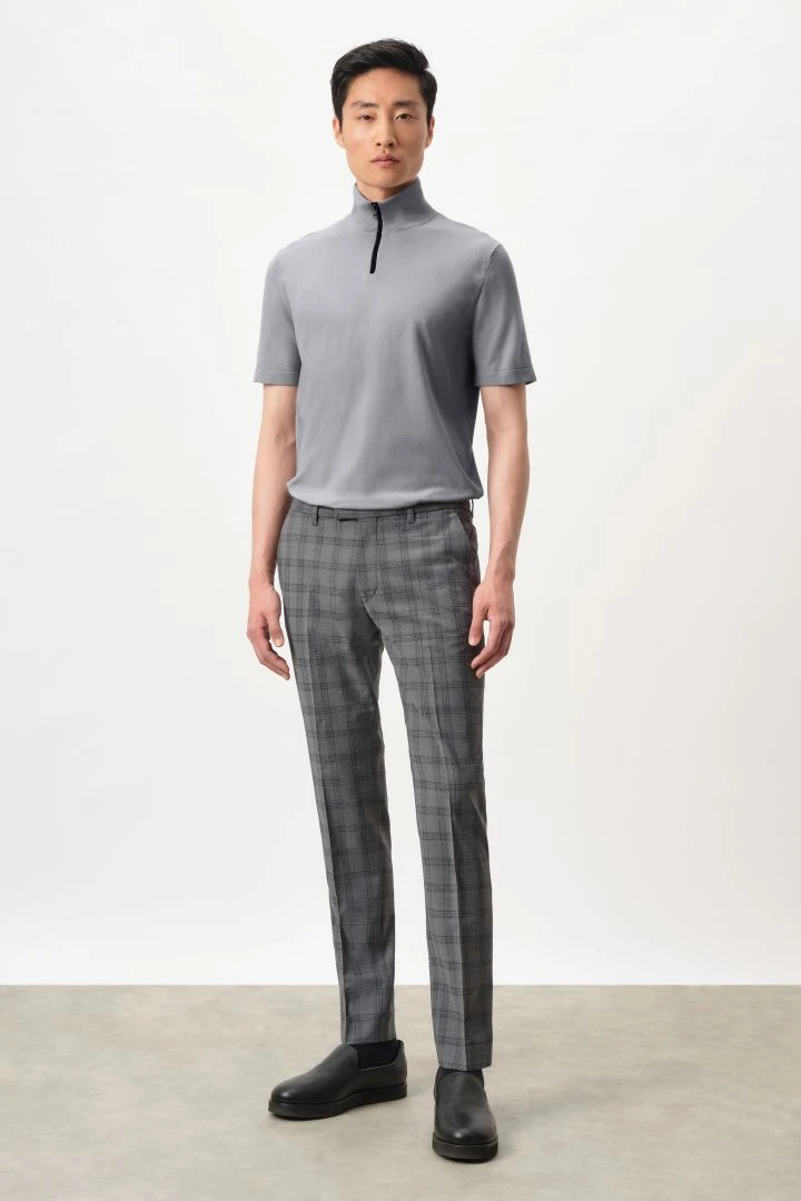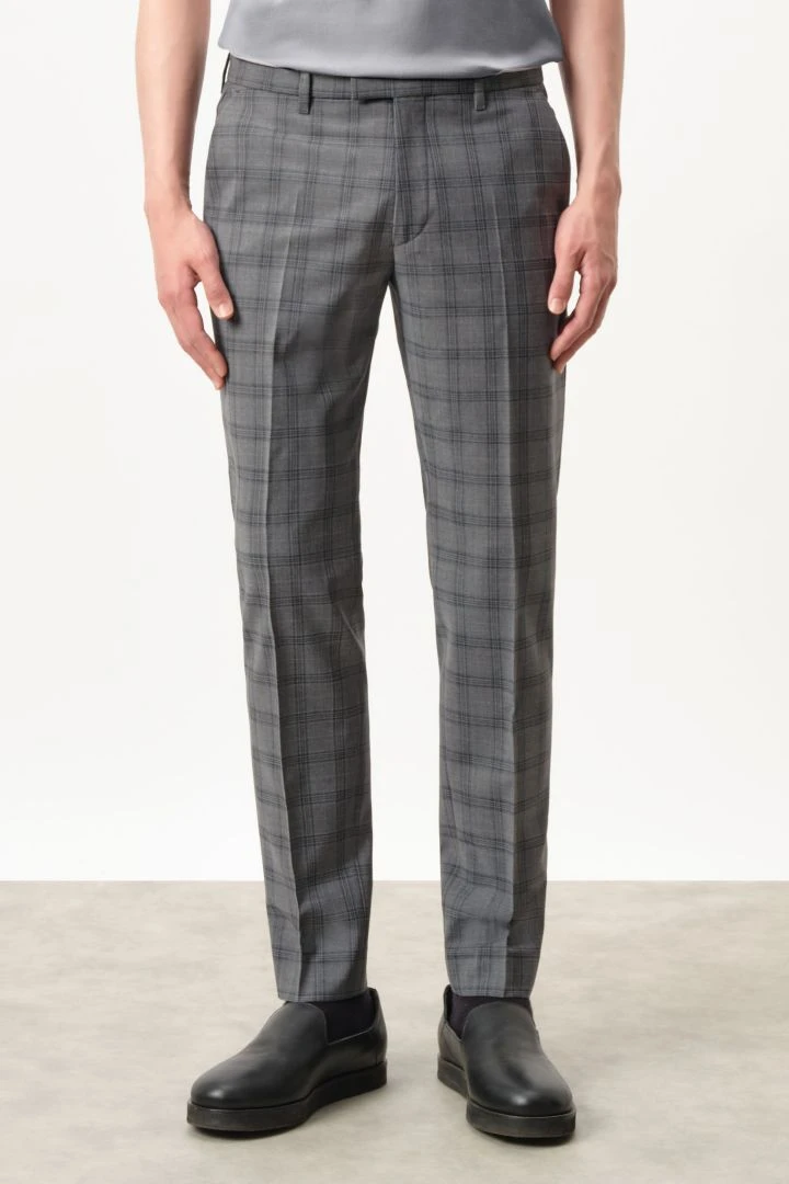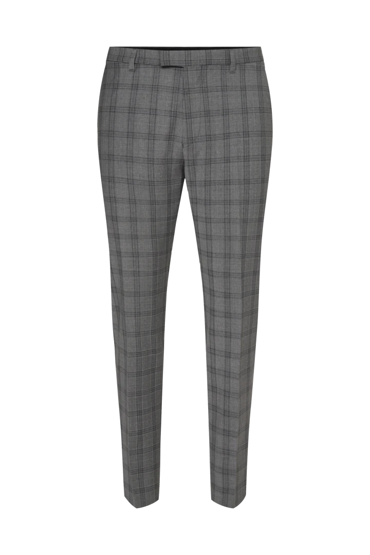 PIET_SK ist eine klassische Anzughose mit Bügelfalte und schmal zulaufenden Beinen. Durch ihre mittlere Bundhöhe sitzt sie knapp unterhalb der Hüfte.