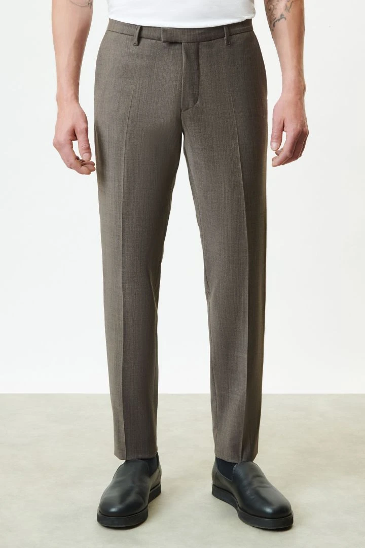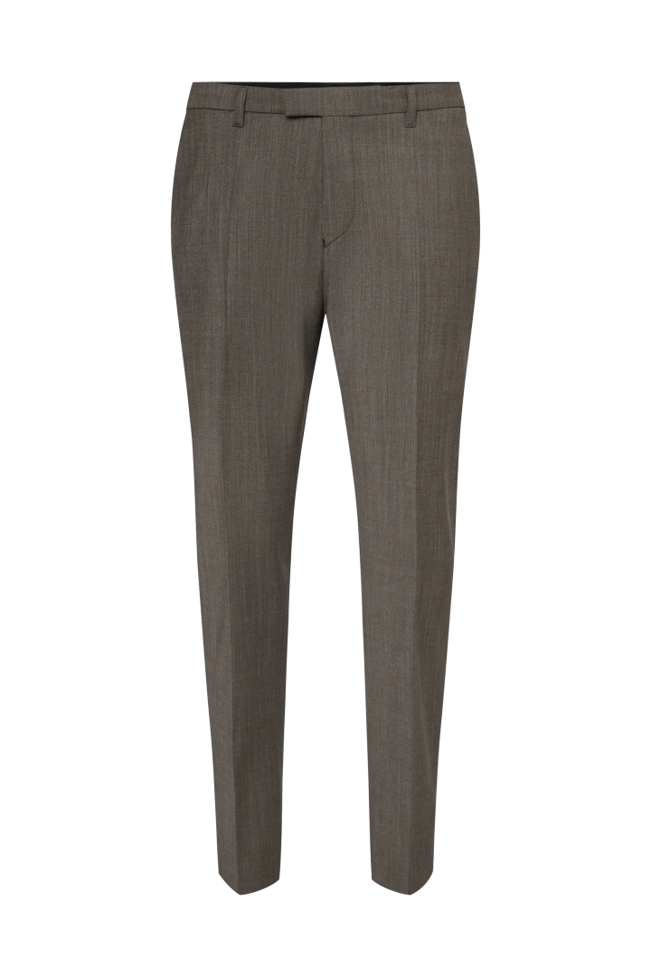 PIET_SK ist eine klassische Anzughose mit Bügelfalte und schmal zulaufenden Beinen. Durch ihre mittlere Bundhöhe sitzt sie knapp unterhalb der Hüfte.