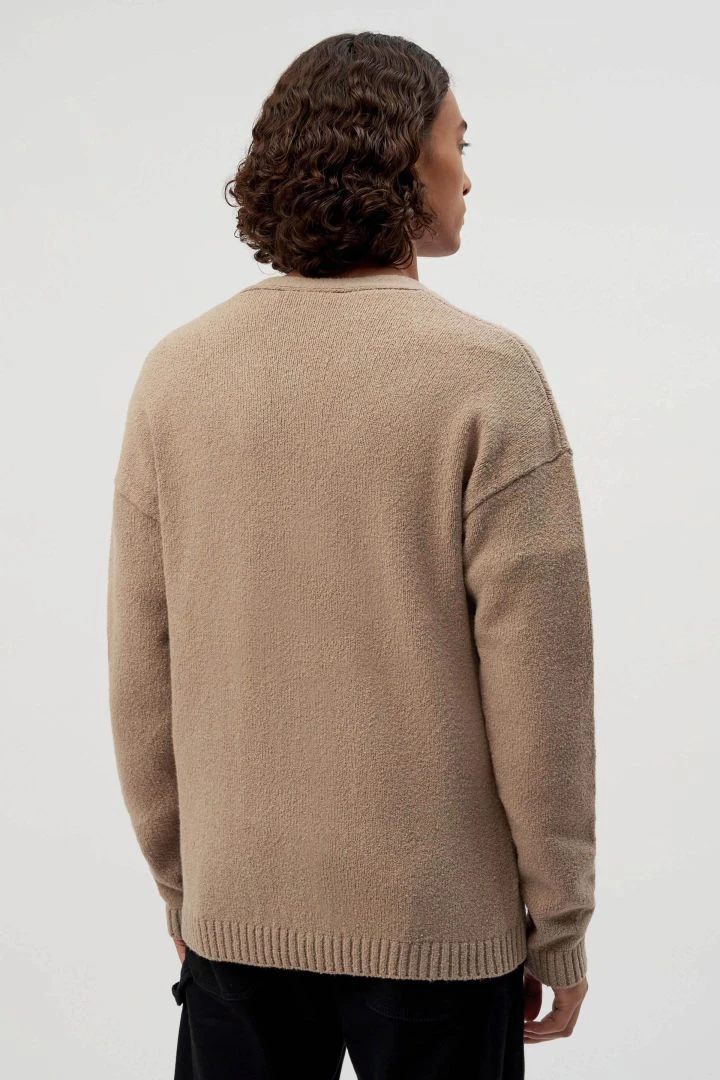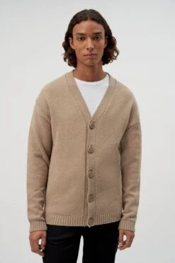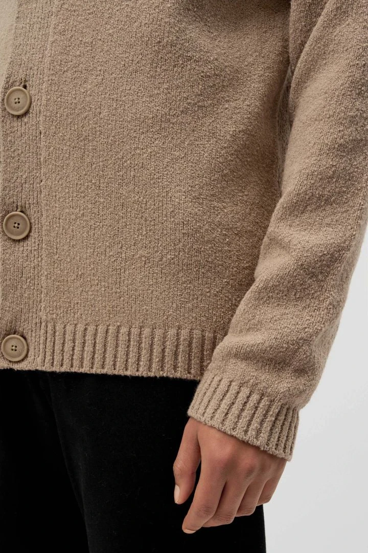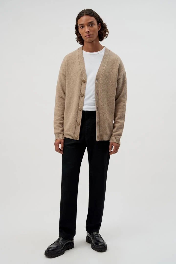NADIR ist eine moderne Interpretation eines Strickcardigans und verfügt über tonal abgestimmte Knöpfe, leicht überschnittene Schultern und Rippendetails am Saum.