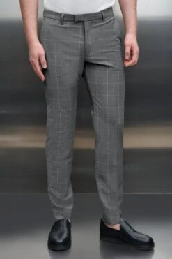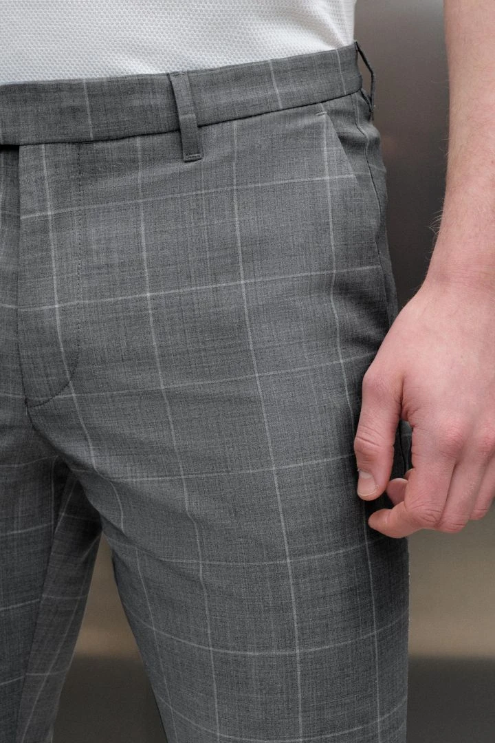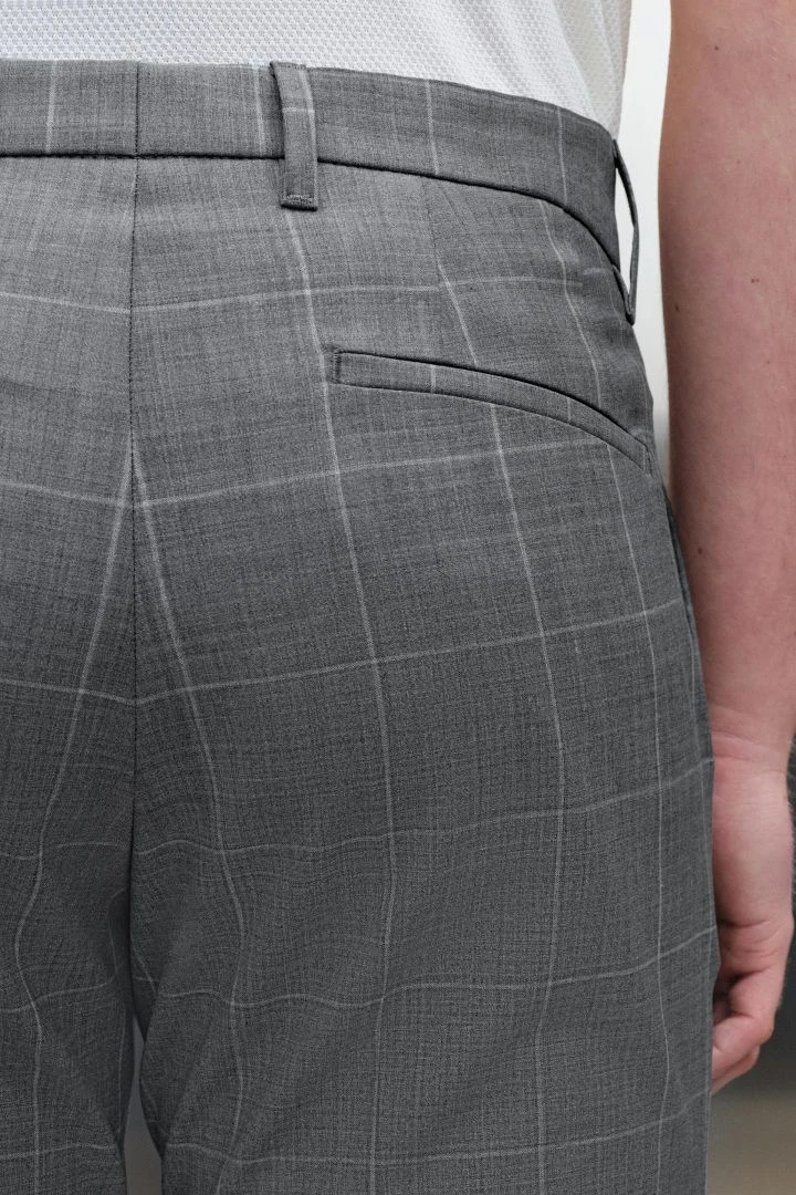 PIET_SK ist eine klassische Anzughose mit Bügelfalte und schmal zulaufenden Beinen. Durch ihre mittlere Bundhöhe sitzt sie knapp unterhalb der Hüfte.